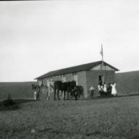 School children and horses in front of the Empire School. E. L. Vail owned the building and leased it out in 1897 to be used for the school which was near but not part of the ranch.